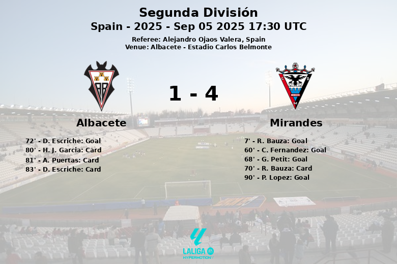 Albacete, Espagne – Mirandés a surpris Albacete sur son propre terrain, l’Estadio Carlos Belmonte, avec une victoire qui reflète son efficacité face au but. Le match, correspondant à la quatrième journée de la Segunda División, était arbitré par Alejandro Ojaos Valera.