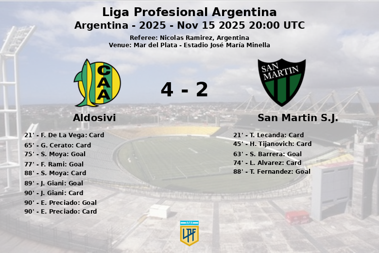 Le match semblait se diriger vers une victoire à domicile, mais San Martín SJ a égalisé à la 88e minute grâce à un penalty de T. Fernandez. La joie des visiteurs a été de courte durée, puisque J. Giani a redonné l’avantage à Aldosivi à la 89e minute. Dans le temps additionnel, E. Preciado a scellé le match avec un autre but sur penalty à la 90e minute.