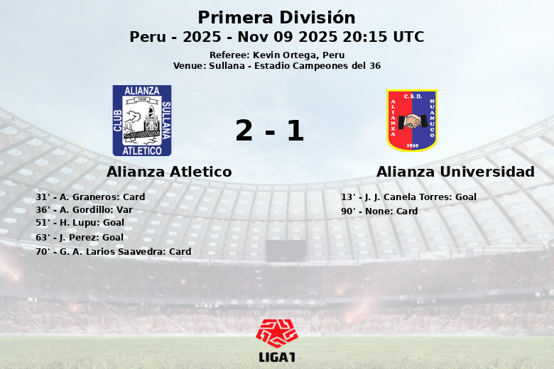 Remplacements dans l’quipe de alianza universidad: À la 46e minute, M. Lliuya est entré et P. Fuentes est sorti., À la 59e minute, J. Mendieta est entré et N. Ramirez est sorti., À la 71e minute, J. J. Canela Torres est entré et R. Campodonico est sorti., À la 79e minute, A. Perleche est entré et G. Iraola est sorti., À la 79e minute, B. Guevara est entré et J. Ibarguen est sorti.