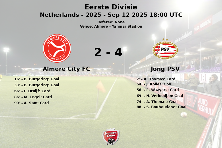 Almere, Pays-Bas – Dans un match palpitant et plein d’action qui s’est déroulé au Yanmar Stadion, Jong PSV a triomphé d’Almere City FC lors d’un match correspondant à la cinquième journée de l’Eerste Divisie. Le match, qui s’est déroulé le 12 septembre 2025, a vu une pluie de buts et de cartons jaunes qui ont tenu les supporters en haleine.