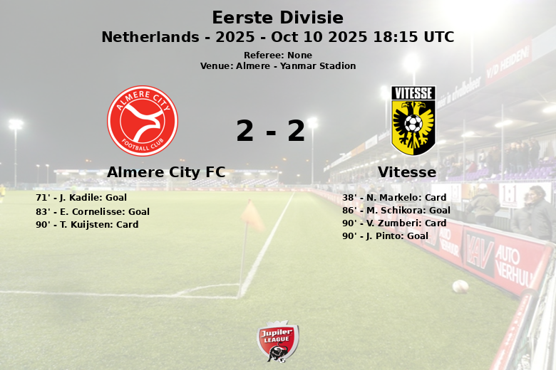 Le premier but du match a été marqué à la 71e minute par J. Kadile pour Almere City FC. L’avantage des locaux a été accru à la 83e minute avec un but de E. Cornelisse. Alors que le match semblait plié, Vitesse a réagi et réduit l’écart à la 86e minute grâce à M. Schikora. Dans le temps additionnel, J. Pinto a réussi à égaliser pour Vitesse.