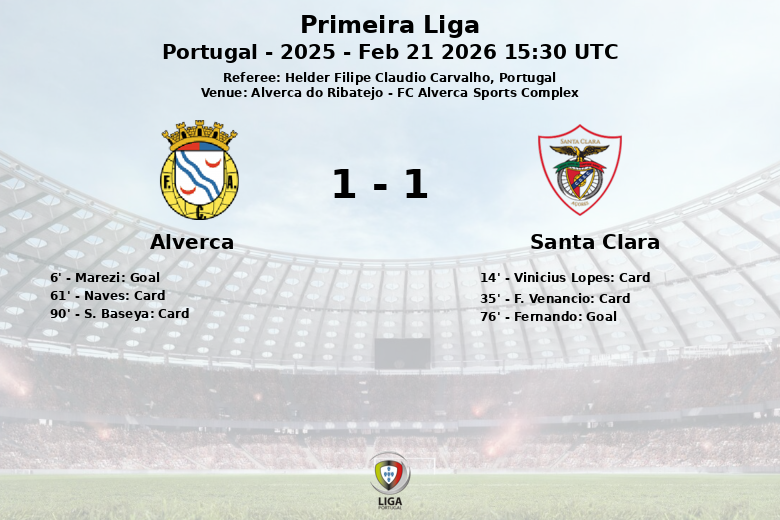 Alverca do Ribatejo, Portugal – Dans un match rempli d’émotion et de batailles tactiques, Alverca et Santa Clara ont fait match nul au FC Alverca Sports Complex, lors de la 23e journée de la Primeira Liga. La rencontre, supervisée par l’arbitre Helder Filipe Claudio Carvalho, a vu Alverca prendre une avance précoce (6′) grâce à un but de Marezi sur penalty.