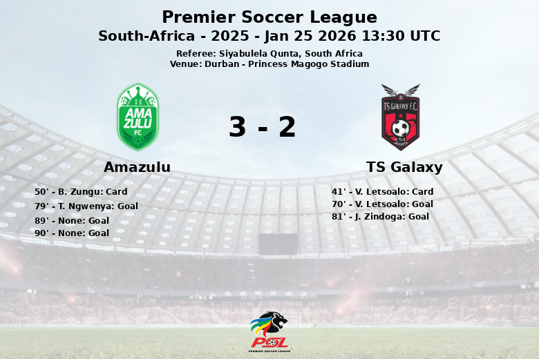 La joie fut de courte durée pour l’équipe locale, puisque J. Zindoga a redonné l’avantage à TS Galaxy à la 81e minute. Alors qu’il semblait que la victoire allait revenir à l’équipe visiteuse, Amazulu a réalisé une remontée incroyable avec deux buts aux 89e et 90e minutes, sauvant ainsi un point précieux à domicile.