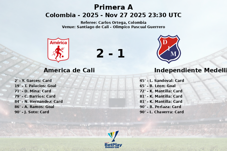 Santiago de Cali, 27 novembre 2025 – Dans un match chargé d’émotions et de cartons, l’América de Cali a battu l’Independiente Medellín au stade Olimpico Pascual Guerrero, lors d’un match comptant pour la troisième journée du quadrangulaire du Clausura de la Primera A colombienne.