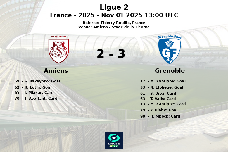 Grenoble a pris l’avantage en début de match avec un but de M. Xantippe à la 17e minute, sur une passe décisive de S. Diba. Ils ont creusé l’écart à la 33e minute grâce à N. Elphege, qui a reçu une passe précise de J. Benet. Cependant, Amiens n’a pas abandonné et s’est battu pour revenir dans le match en seconde période.