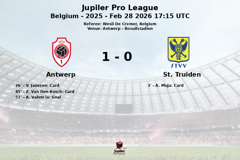 La première mi-temps s’est terminée sans but, mais avec des avertissements pour les deux équipes. A. Muja de Saint-Trond a reçu un carton jaune à la 3e minute, tandis que V. Janssen et Z. Van Den Bosch de l’Antwerp ont été avertis aux 26e et 45e minutes respectivement.