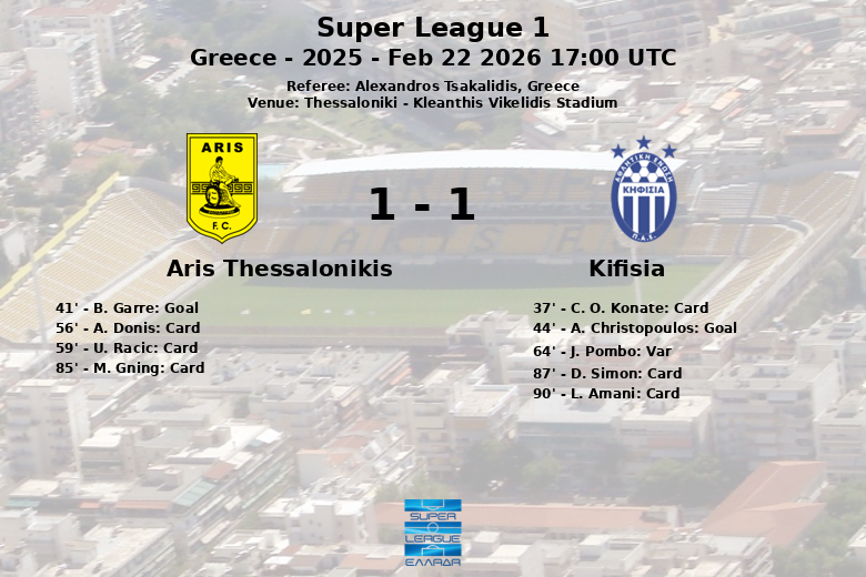 Le match s’est ouvert à la 41e minute avec un but de B. Garre pour l’Aris Salonique, sur une passe décisive de A. Tejero. Cependant, la joie fut de courte durée, car A. Christopoulos a égalisé pour Kifisia à la 44e minute, sur une passe décisive de Y. Larouci. L’intensité du jeu s’est reflétée dans le nombre de fautes commises, 17 par l’Aris Salonique et 19 par Kifisia, ainsi que dans les cartons jaunes distribués (3 pour chaque équipe). Le match a également connu des moments de controverse, comme l’annulation d’un but pour Kifisia en raison d’une faute signalée par la VAR à la 64e minute. Malgré l’insistance de l’Aris Salonique, qui a obtenu 8 corners, le score n’a pas changé, le match se terminant par un match nul.