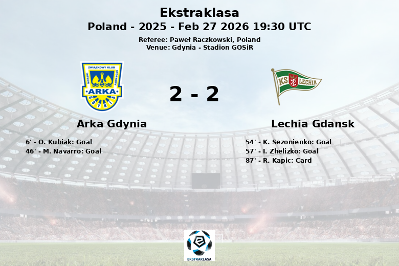 Remplacements dans l’quipe de arka gdynia: À la 71e minute, E. D. Espiau Hernandez est entré et V. Gutkovskis est sorti., À la 80e minute, K. Jakubczyk est entré et A. Nguiamba est sorti., À la 80e minute, M. Navarro est entré et D. Kocyla est sorti., À la 86e minute, N. Rusyn est entré et P. Szysz est sorti.