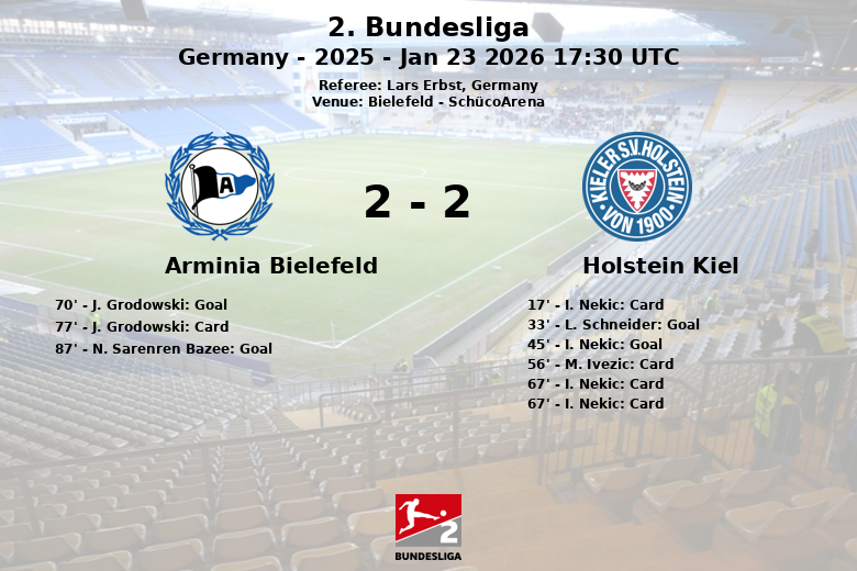 Holstein Kiel a pris l’avantage grâce à un but contre son camp de L. Schneider à la 33e minute, suivi d’un but de I. Nekic juste avant la mi-temps (45e minute). La seconde mi-temps a vu la réaction d’Arminia Bielefeld. J. Grodowski a réduit le score sur penalty à la 70e minute. La situation s’est encore compliquée pour Holstein Kiel lorsque I. Nekic a été expulsé à la 67e minute après avoir reçu un deuxième carton jaune. Finalement, N. Sarenren Bazee a réussi à égaliser pour Arminia Bielefeld à la 87e minute, grâce à une passe décisive de R. Uldrikis.