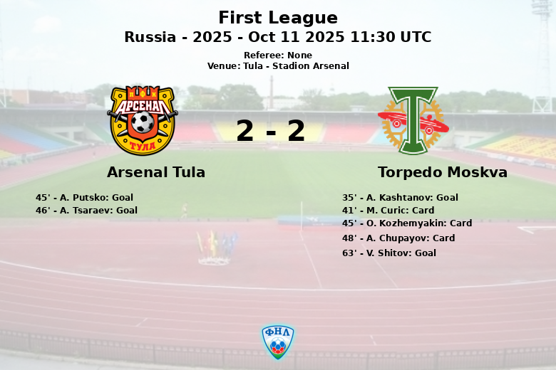 Tula a été le théâtre d’un match vibrant entre Arsenal Tula et Torpedo Moscou, qui s’est terminé par un match nul qui a tenu les supporters en haleine. Torpedo Moscou a pris l’avantage à la 35e minute avec un but d’A. Kashtanov, suite à une action sans passe décisive. Cependant, Arsenal Tula a répondu juste avant la mi-temps, à la 45e minute, avec un but d’A. Putsko.