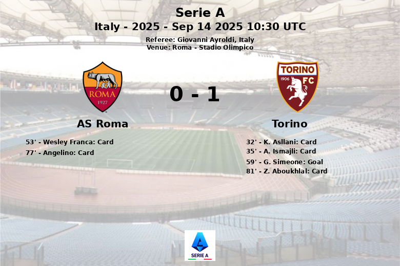 Dans un match disputé au Stadio Olimpico de Rome, le Torino a remporté une courte victoire contre une Roma qui a dominé la possession du ballon (73%) mais n’a pas réussi à concrétiser ses occasions. Le seul but du match a été marqué à la 59e minute par G. Simeone, sur une passe décisive de C. Ngonge, réduisant au silence le public local.