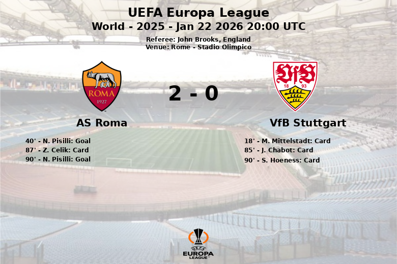 En seconde période, les deux équipes ont cherché à imposer leur jeu. Stuttgart a tenté d’inverser le score, en générant plus de tirs (15 au total contre 11 pour Roma), mais seulement cinq d’entre eux ont été cadrés. La Roma, pour sa part, est restée solide en défense et a profité de ses occasions. Le match s’est échauffé dans les dernières minutes, avec des cartons jaunes pour J. Chabot et S. Hoeness de Stuttgart, et pour Z. Celik de Roma. Finalement, à la 90e minute, N. Pisilli a scellé la victoire de la Roma avec son deuxième but du match, cette fois sur une passe décisive de P. Dybala.