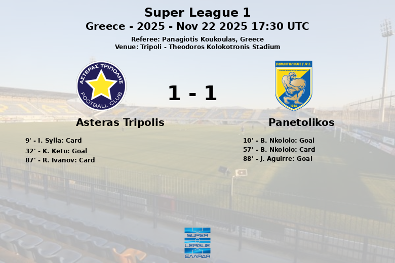 Panetolikos a ouvert le score à la 10e minute avec un but de B. Nkololo, qui s’est racheté après avoir manqué un penalty quelques instants auparavant. Cependant, Asteras Tripolis a réagi, et K. Ketu a égalisé à la 32e minute, grâce à une passe décisive de E. Yablonskiy.
