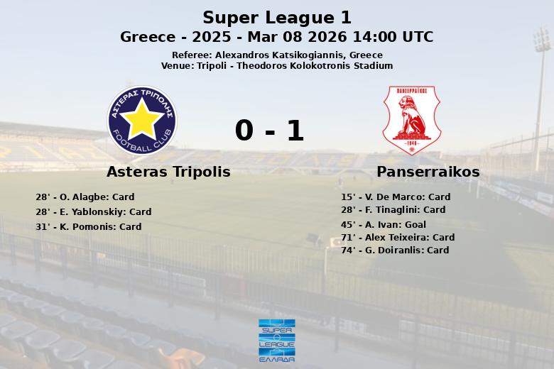 La première mi-temps a été particulièrement agitée. V. De Marco du Panserraikos a reçu un carton jaune à la 15e minute. La 28e minute s’est avérée être un tournant, avec des cartons jaunes pour F. Tinaglini (Panserraikos) et O. Alagbe (Asteras Tripolis), ainsi qu’un carton rouge pour E. Yablonskiy d’Asteras Tripolis, laissant son équipe à dix joueurs. K. Pomonis d’Asteras Tripolis a également été averti à la 31e minute. Juste avant la mi-temps, A. Ivan de Panserraikos, avec une passe décisive de M. Tsaousis, a marqué le seul but du match à la 45e minute.
