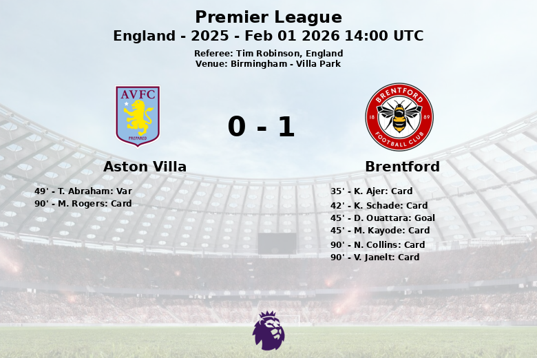 Malgré la domination territoriale d’Aston Villa, qui a généré 26 tirs (5 cadrés) et 12 corners, c’est Brentford qui a pris l’avantage à la 45e minute grâce à un but de D. Ouattara. Ce but est intervenu à un moment clé, juste avant la mi-temps, et a permis de compenser une première mi-temps compliquée pour les visiteurs.