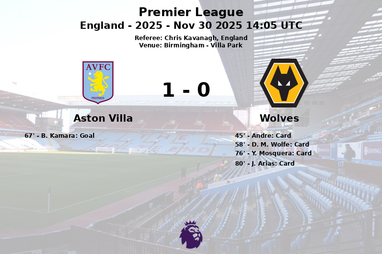 La première mi-temps s’est déroulée sans but, mais avec quelques actions notables. À la 45e minute, Andre (Wolves) a reçu un carton jaune. La deuxième mi-temps a apporté plus d’émotion. À la 67e minute, B. Kamara (Aston Villa) a ouvert le score avec un but, sur une passe décisive de J. McGinn.