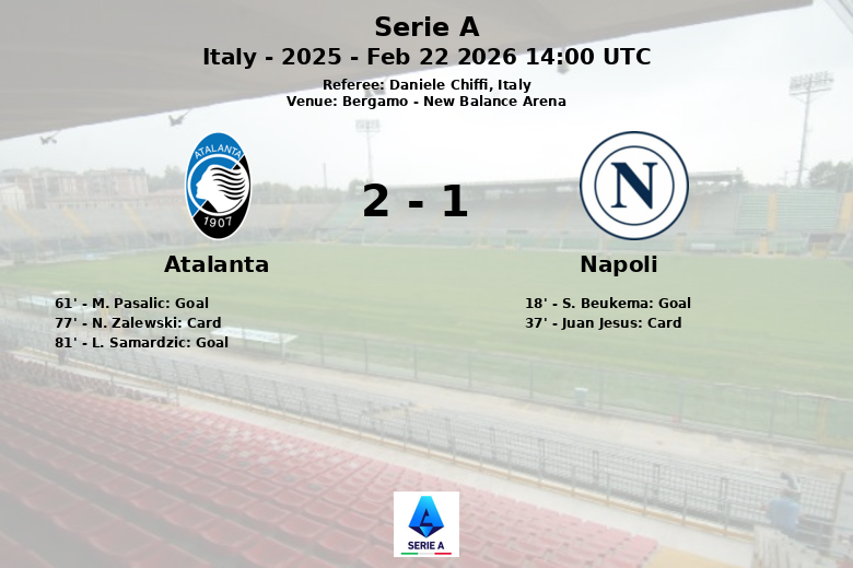 Bergame, Italie – Dans un match de Série A acharné qui s’est déroulé au New Balance Arena, l’Atalanta a réussi à vaincre Naples grâce à une remontée qui a laissé les fans au bord de leur siège. Le match, arbitré par Daniele Chiffi, a commencé par un but de Naples à la 18e minute, marqué par S. Beukema, sur une passe de M. Gutierrez, donnant l’avantage à l’équipe visiteuse. Juan Jesus a reçu un carton jaune à la 37e minute.
