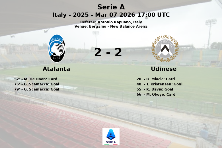 L’Udinese a pris l’avantage à la 40e minute grâce à un but de T. Kristensen, sur une passe décisive de N. Zaniolo. K. Davis a accentué l’avantage des visiteurs à la 55e minute. Cependant, l’Atalanta a réagi avec force dans la dernière ligne droite du match. G. Scamacca a marqué deux buts, aux 75e et 79e minutes, le premier sur une passe décisive de N. Zalewski, pour égaliser le score.