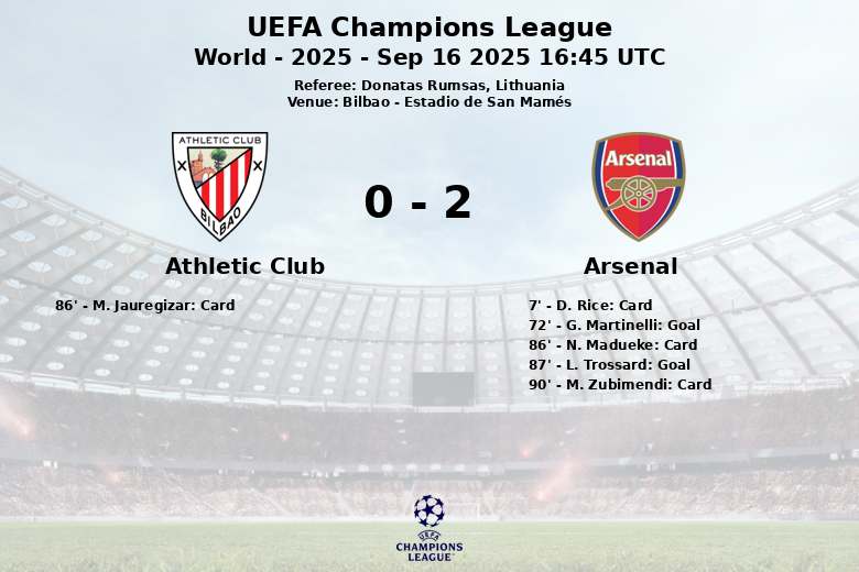 La seconde période a apporté l’excitation des buts. G. Martinelli a ouvert le score pour Arsenal à la 72e minute, sur une passe décisive de L. Trossard. L’Athletic Club, bien que luttant pour trouver l’égalisation, a été surpassé par la défense d’Arsenal. L’équipe locale a reçu un carton jaune à la 86e minute. Arsenal, avec un carton jaune à la même minute, a consolidé sa victoire à la 87e minute grâce à un but de L. Trossard, cette fois sur une passe décisive de G. Martinelli. Dans le temps additionnel, l’arbitre a montré un nouvel avertissement à Arsenal.