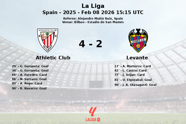 Bien qu’il ait joué à dix pendant la majeure partie du match, Levante a fait preuve de courage et a réussi à réduire l’écart à la 81e minute grâce à un but de U. Elgezabal. Cependant, l’Athletic Club a répondu avec deux buts supplémentaires dans les dernières minutes, marqués par N. Serrano à la 86e minute et R. Navarro à la 90e minute. Levante a de nouveau marqué à la 90e minute, cette fois par l’intermédiaire de J. A. Olasagasti, clôturant le score à 4 à 2.