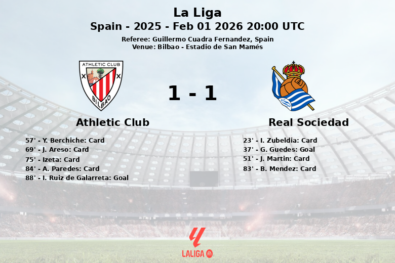 L’Athletic Club n’a pas abandonné et a cherché avec insistance le but égalisateur. Leur pression a été récompensée à la 88e minute, lorsque I. Ruiz de Galarreta, sur une passe décisive de Y. Berchiche, a égalisé le score. La fin du match a été pleine de tension, notamment après l’expulsion de B. Mendez de la Real Sociedad à la 83e minute. Le match a été caractérisé par un nombre élevé de fautes (14 pour chaque équipe) et de cartons, dont quatre jaunes pour l’Athletic Club et deux jaunes et un rouge pour la Real Sociedad. L’Athletic Club a effectué 19 tirs, dont 4 cadrés, tandis que la Real Sociedad a tenté 8 tirs, dont 6 cadrés. Le match nul reflète un match très disputé et témoigne de la compétitivité entre les deux équipes.
