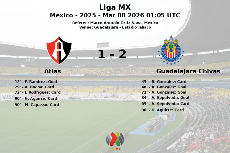 Remplacements dans l’quipe de atlas: À la 79e minute, E. Zaldivar est entré et V. H. Rios De Alba est sorti., À la 87e minute, S. Hernandez est entré et E. Aguirre est sorti., À la 87e minute, A. Gonzalez est entré et A. Rodriguez est sorti., À la 90e minute, A. Rocha est entré et L. Gamboa est sorti.