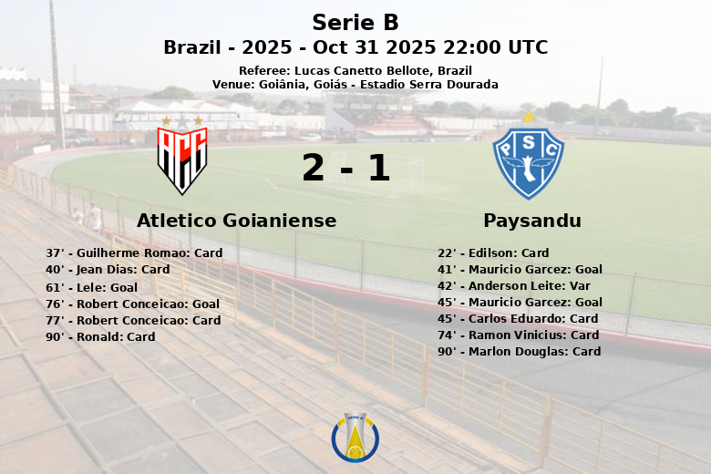 Goiânia, Goiás – Dans un match disputé à l’Estádio Serra Dourada, l’Atlético Goianiense a battu Paysandu dans une rencontre pleine d’action et de polémiques. L’arbitre Lucas Canetto Bellote a eu une soirée chargée en distribuant plusieurs cartons jaunes, trois pour chaque équipe.