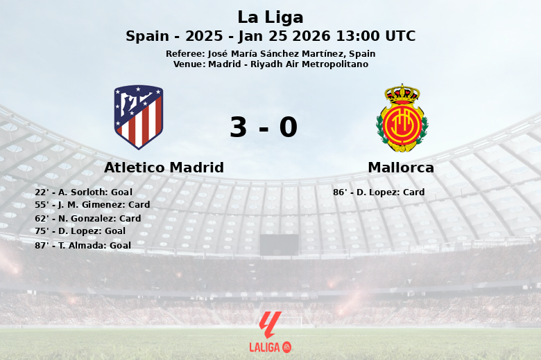 Le premier but du match est arrivé à la 22e minute, grâce à un but de A. Sorloth. La supériorité des Rojiblancos s’est traduite par un deuxième but, cette fois avec un but contre son camp de D. Lopez à la 75e minute, facilitant encore davantage la voie vers la victoire. Majorque, avec 40 % de possession et seulement 6 tirs, a tenté de réagir, mais s’est heurté à une défense solide et à un Atlético de Madrid déterminé à garder le contrôle. Le but définitif est intervenu à la 87e minute par T. Almada, consolidant ainsi la victoire de l’équipe madrilène. Le match a également connu des moments de tension, reflétés par les cartons jaunes pour J. M. Gimenez et N. Gonzalez pour l’Atlético de Madrid, et pour D. Lopez pour Majorque. L’Atlético Madrid a obtenu 9 corners en sa faveur et a commis 10 fautes. De son côté, Majorque a obtenu 3 corners et a commis 7 fautes.