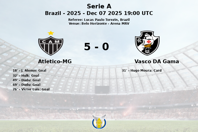 Hulk a étendu l’avance de l’Atlético-MG à la 32e minute, sans assistance, consolidant sa supériorité. En seconde période, Dudu a marqué un doublé, aux 49e et 69e minutes, sur des passes décisives de Hulk et Igor Gomes, respectivement, enterrant les espoirs de Vasco. Un but contre son camp de Victor Luis à la 76e minute a scellé le sort du match, portant le score à une différence encore plus grande. Malgré une possession de 42 %, Vasco da Gama a à peine réussi à générer du danger, avec un seul tir non cadré pendant tout le match. L’Atlético-MG a contrôlé le rythme et l’intensité du jeu, assurant une victoire convaincante devant ses supporters.