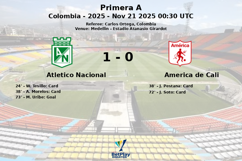 La deuxième mi-temps a vu le seul but du match, marqué par Mateus Uribe à la 73e minute, sur une passe décisive de Marlos Moreno, déclenchant l’euphorie chez les supporters locaux. América de Cali a tenté de réagir, mais s’est heurté à une solide défense de l’équipe ‘Verdolaga’. Le match a également vu un autre carton jaune pour Juan Camilo Soto d’América de Cali.
