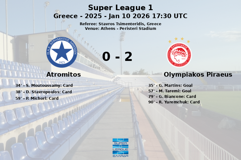 Le match a été caractérisé par un jeu physique, avec un total de 28 fautes commises par les deux équipes. L’arbitre a distribué 4 cartons jaunes, 3 à l’Atromitos (S. Moutoussamy, D. Stavropoulos et P. Michorl) et 2 à l’Olympiakos (G. Biancone et R. Yaremchuk).