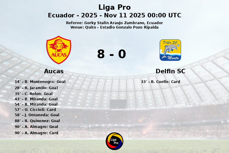 Remplacements dans l’quipe de aucas: À la 60e minute, U. Ciccioli est entré et S. Porozo est sorti., À la 61e minute, A. L. Spina est entré et T. Serpa est sorti., À la 73e minute, B. Montenegro est entré et E. Pepinos est sorti., À la 73e minute, R. Jaramilo est entré et R. Quinonez est sorti., À la 79e minute, J. Mina est entré et A. Almagro est sorti.