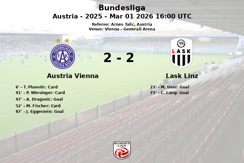 Le LASK Linz a pris l’avantage grâce à un but de M. Usor à la 23e minute, sur une passe décisive de K. P. Molgaard Jorgensen. L’Austria Vienne a réagi rapidement, A. Dragovic égalisant à la 47e minute. Le LASK Linz a repris l’avantage à la 73e minute grâce à un but de C. Lang, sur une passe décisive de M. Usor. Cependant, la ténacité de l’Austria Vienne a été récompensée par un penalty transformé par J. Eggestein à la 87e minute, scellant le match nul final.