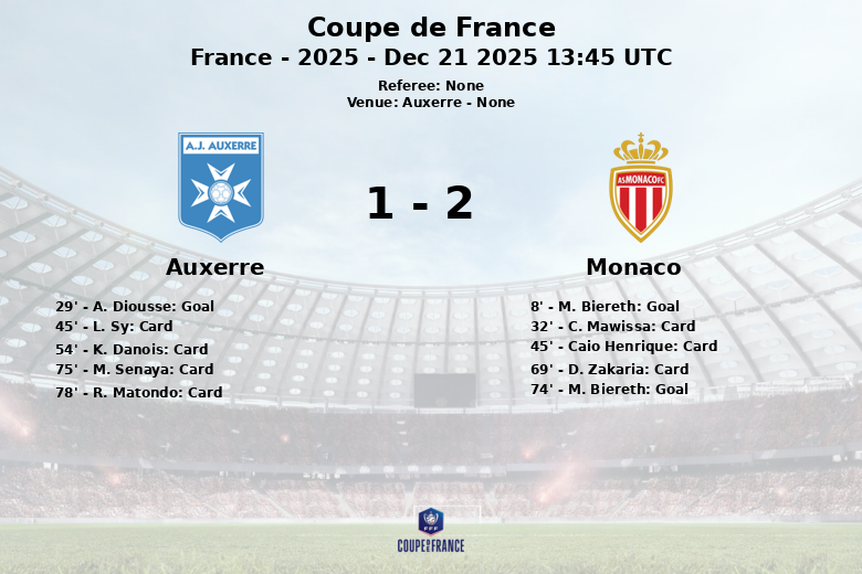 Auxerre, France – Lors d’un match comptant pour les 64e de finale de la Coupe de France, Monaco a remporté une victoire importante contre Auxerre. La rencontre, disputée à Auxerre, a été marquée par son intensité et une lutte constante au milieu de terrain.
