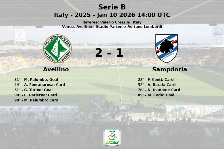 En deuxième mi-temps, Avellino a creusé l’écart à la 51e minute avec un but de G. Tutino, à nouveau servi par T. Biasci. La Sampdoria, cherchant à revenir au score, a intensifié ses attaques. Cependant, à la 85e minute, M. Coda a réussi à réduire le déficit grâce à un penalty.