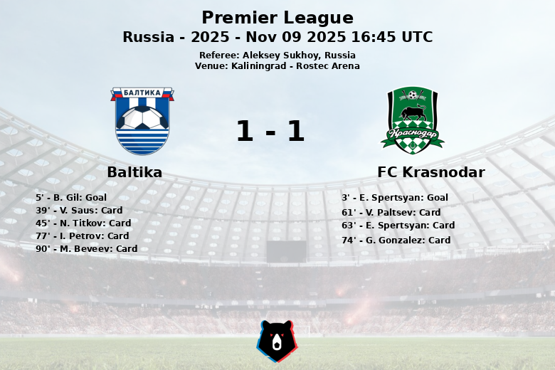Kaliningrad, Russie – Dans un match disputé à la Rostec Arena, Baltika et le FC Krasnodar ont fait match nul dans un match intense, comptant pour la 15e journée de la Premier League russe. Le match, arbitré par Aleksey Sukhoy, a vu les deux équipes se battre avec acharnement pour la victoire.