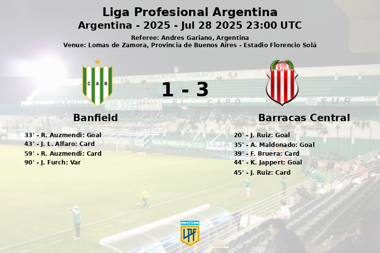 Barracas Central a ouvert le score à la 20e minute avec un but de J. Ruiz, sur une passe décisive de F. Bruera. Banfield a réagi et R. Auzmendi a égalisé à la 33e minute. La chance a souri à Barracas Central deux minutes plus tard lorsqu’A. Maldonado a marqué contre son propre camp, redonnant ainsi l’avantage à l’équipe visiteuse. K. Jappert a creusé l’écart pour Barracas Central à la 44e minute, juste avant la pause.