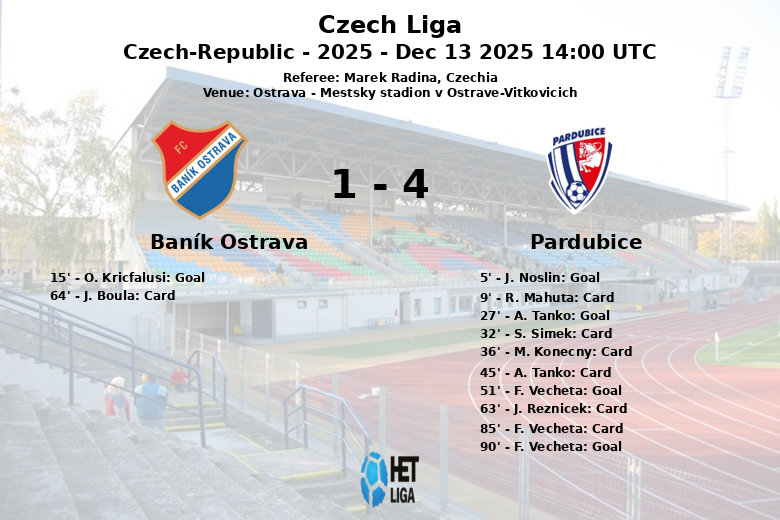 En seconde période, Pardubice a accru son avance avec un but de F. Vecheta à la 51e minute, à nouveau servi par R. Mahuta. Bien que Baník Ostrava ait tenté de réagir, la défense de Pardubice s’est montrée solide, et F. Vecheta a scellé le match avec son deuxième but à la 90e minute, assisté par V. Sychra, assurant une victoire importante pour son équipe.