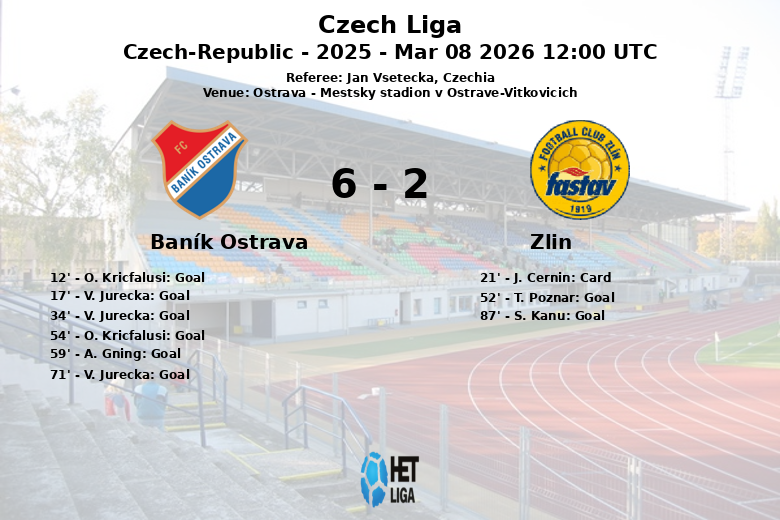 Zlín a tenté de réagir en deuxième mi-temps, et T. Poznar a réduit l’écart à la 52e minute, assisté par D. Machalik. Cependant, la réponse de Baník a été énergique. O. Kricfalusi a marqué à nouveau à la 54e minute, et A. Gning s’est joint à la fête des buts à la 59e minute, assisté par M. Rusnak. V. Jurecka a complété son coup du chapeau à la 71e minute, assisté par A. Gning.