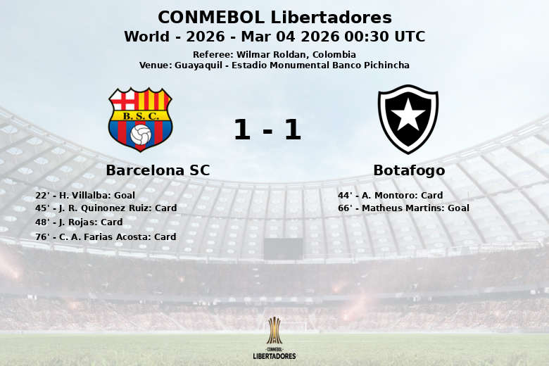 Le match, qui s’est joué le 4 mars 2026, a été caractérisé par une forte intensité et plusieurs avertissements. A. Montoro de Botafogo a reçu un carton jaune à la 44e minute, tandis que J. R. Quiñonez Ruiz et J. Rojas de Barcelona SC ont été avertis aux 45e et 48e minutes respectivement. La situation s’est compliquée pour l’équipe locale lorsque C. A. Farias Acosta a reçu un carton rouge à la 76e minute.