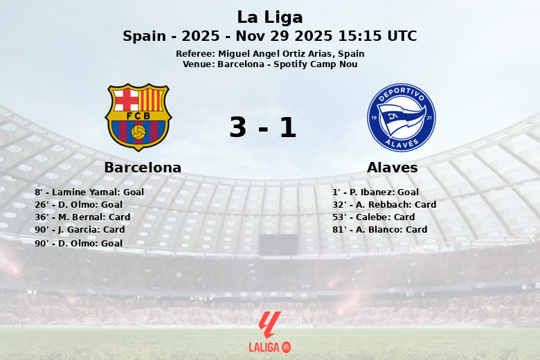 Dans le temps additionnel, D. Olmo a scellé le match avec son deuxième but, à la 90e minute, de nouveau sur une passe de Lamine Yamal, scellant ainsi une victoire importante pour Barcelone dans sa lutte pour les premières places de La Liga. Barcelone a dominé la possession avec 69%, a effectué 18 tirs (6 cadrés) et a obtenu 5 corners, tandis qu’Alavès a eu 31% de possession, 9 tirs (3 cadrés) et 4 corners. L’arbitre, Miguel Angel Ortiz Arias, a officié le match, qui faisait partie de la 14e journée de la saison régulière de La Liga.