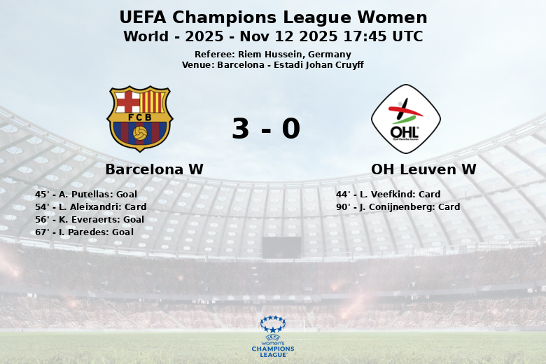 Bien que Barcelone ait généré un total de 40 tirs, dont 15 cadrés et 15 non cadrés, sa domination au milieu de terrain et sa solidité défensive ont été essentielles pour garder sa cage inviolée. OH Leuven, pour sa part, a été surpassé et a commis 8 fautes, recevant deux cartons jaunes pour L. Veefkind et J. Conijnenberg. Barcelone a reçu un carton jaune pour L. Aleixandri. Le match, correspondant à la troisième journée de la phase de groupes de la Ligue des Champions Féminine de l’UEFA, a été caractérisé par un contrôle total de l’équipe espagnole.