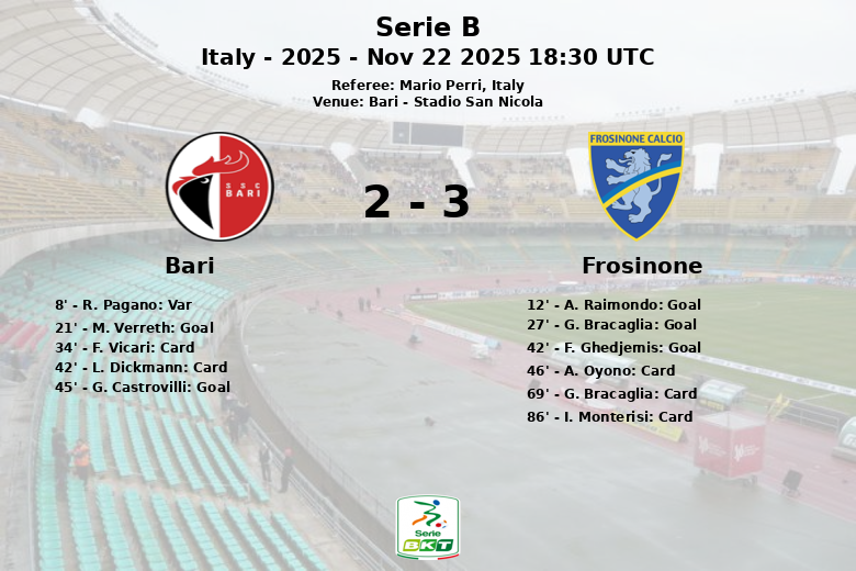 Frosinone a ouvert le score à la 12ème minute grâce à un but de A. Raimondo, sur une passe de I. Monterisi. Bari a répondu avec un but de M. Verreth à la 21ème minute, égalisant les actions. Cependant, Frosinone a repris l’avantage à la 27ème minute grâce à un but de G. Bracaglia, sur une passe de G. Calo. Avant la mi-temps, F. Ghedjemis a creusé l’écart pour Frosinone à la 42ème minute. Bari n’a pas abandonné et G. Castrovilli a réduit l’écart juste avant la fin de la première mi-temps, à la 45ème minute, sur une passe de M. Antonucci.