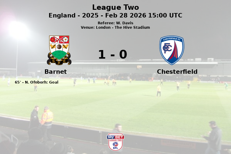 Le seul but du match a été marqué à la 65e minute, lorsque N. Ofoborh de Barnet, servi par B. Winterburn, a réussi à tromper le gardien adverse. Malgré les efforts de Chesterfield pour égaliser, le score est resté inchangé. Les deux équipes ont obtenu 4 corners. Barnet a commis 9 fautes et Chesterfield 6, sans qu’aucune des équipes ne reçoive de cartons jaunes ou rouges. Le match a été intense, mais Barnet a su défendre son avantage et assurer les trois points à domicile.