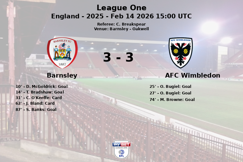 Barnsley et AFC Wimbledon ont offert un match nul passionnant de 3-3 à Oakwell. Barnsley a démarré en force, avec des buts rapides de D. McGoldrick à la 10e minute et de T. Bradshaw à la 14e minute, tous deux assistés par R. Cleary. Cependant, l’AFC Wimbledon a répondu avec deux buts de O. Bugiel aux 25e et 27e minutes, le deuxième étant assisté par J. Tilley, égalisant ainsi le score.