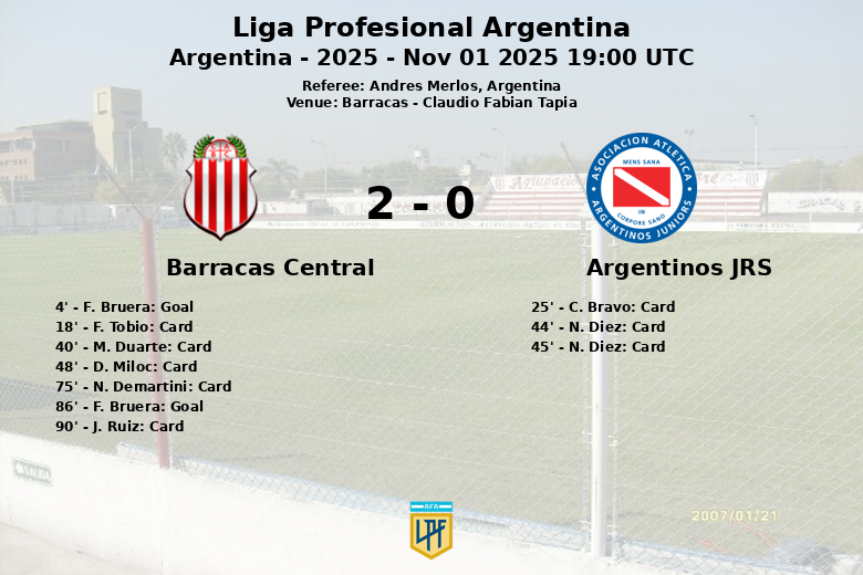 Le match est rapidement devenu tendu, avec une pluie d’avertissements pour les deux équipes. F. Tobio (18′) et M. Duarte (40′) de Barracas Central, et N. Diez (44′) d’Argentinos Juniors ont reçu des cartons jaunes en première mi-temps. La situation s’est envenimée lorsque C. Bravo d’Argentinos Juniors a été expulsé avec un carton rouge direct à la 25e minute, laissant son équipe à dix. Avant la fin de la première mi-temps N. Diez (45′) a été expulsé avec un carton jaune doublé.