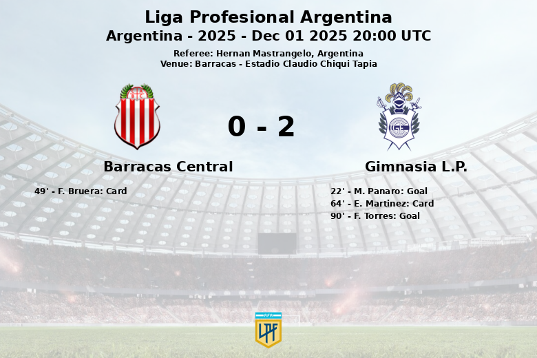 Gimnasia a pris l’avantage à la 22e minute grâce à un but de M. Panaro, qui a profité d’une action sans assistance apparente. Barracas Central a montré son intention de dominer le jeu et a généré un total de 14 tirs, dont 5 cadrés, tandis que Gimnasia a tenté 12 tirs, dont 4 cadrés et 7 non cadrés. L’équipe locale a dû faire face à un carton jaune infligé à F. Bruera à la 49e minute. Gimnasia a également écopé d’un avertissement pour E. Martinez à la 64e minute.