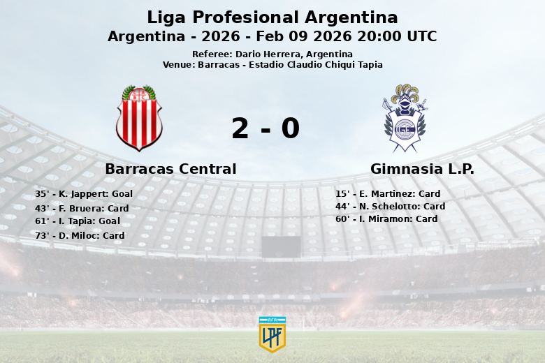Barracas Central, malgré une possession de balle de seulement 34 %, a été plus efficace face au but. K. Jappert a ouvert le score à la 35e minute, suite à une action sans assistance. La première mi-temps a été intense et a été marquée par plusieurs avertissements, d’abord pour E. Martinez de Gimnasia L.P. à la 15e minute, puis pour F. Bruera et N. Schelotto de Barracas Central et Gimnasia L.P. respectivement.