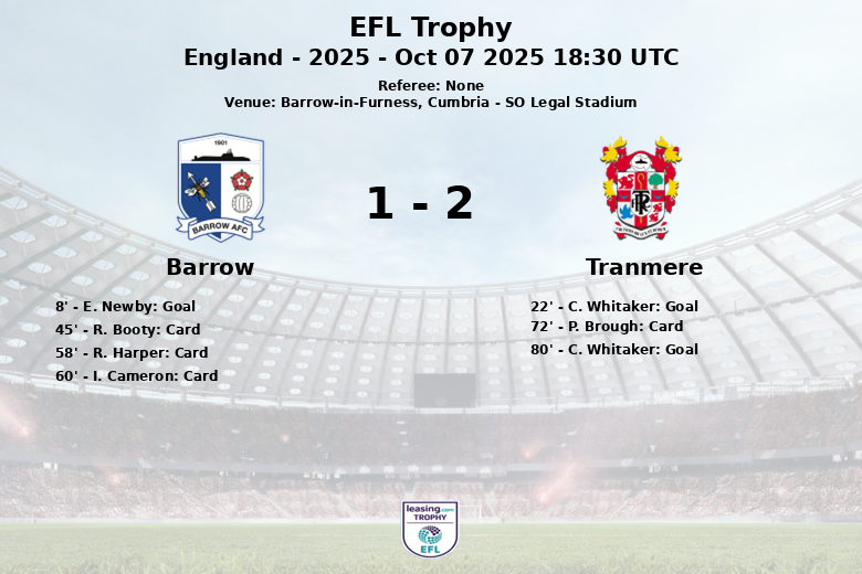 Barrow-in-Furness, Cumbria – Dans un match disputé au SO Legal Stadium, Tranmere Rovers a remporté la victoire contre Barrow lors du tour Northern – 2 de l’EFL Trophy. Malgré un but précoce de Barrow à la 8ème minute, marqué par Barrow sur une passe de T. Walker, Tranmere Rovers a démontré sa supériorité sur le terrain.