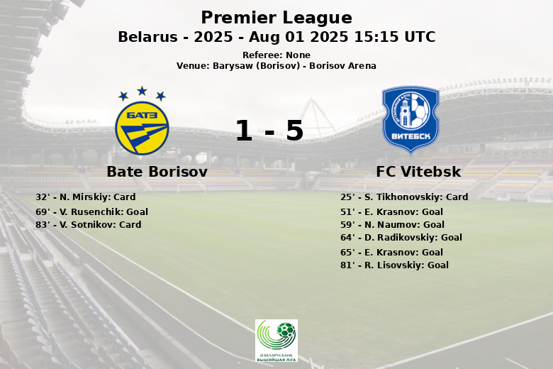 Barysaw (Borisov), Biélorussie – Lors d’une rencontre de Premier League qui s’est déroulée à la Borisov Arena, le FC Vitebsk a fait preuve d’une efficacité impressionnante en battant le BATE Borisov sur un score sans appel. Le match, correspondant à la 16e journée de la saison régulière, a été le théâtre d’une démonstration offensive du Vitebsk, qui a sévèrement puni la défense de l’équipe locale.